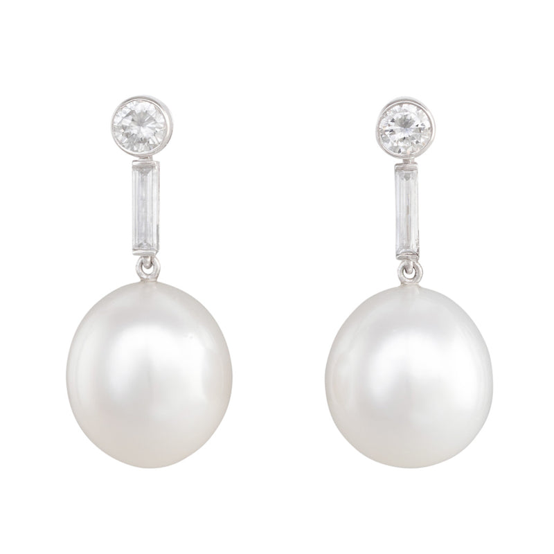 A pair of drop-shaped white South Sea pearl and diamond drop stud earrings in platinum and 18ct white gold featuring pearls measuring 11 - 13mm with a bright lustre and few natural surface marks. The pearls are set articulated from brilliant and baguette cut diamonds with a total diamond weight of 0.40ct