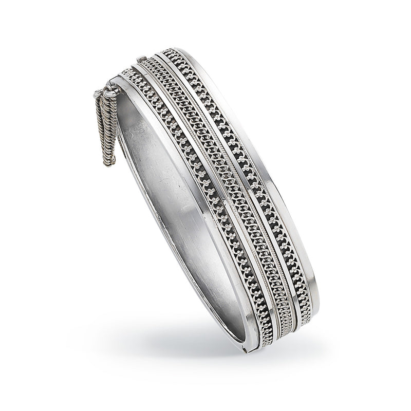Antique hinged silver bangle with rows of intricate pattern to the top, plain polished to the underside, fastening with push tongue clasp and heavy curb link safety chain.