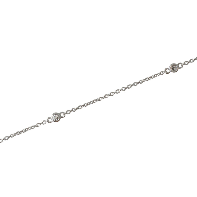 18ct white gold chain bracelet with four round brilliant cut diamonds in bezel settings at intervals and fastening with a parrot clasp.
