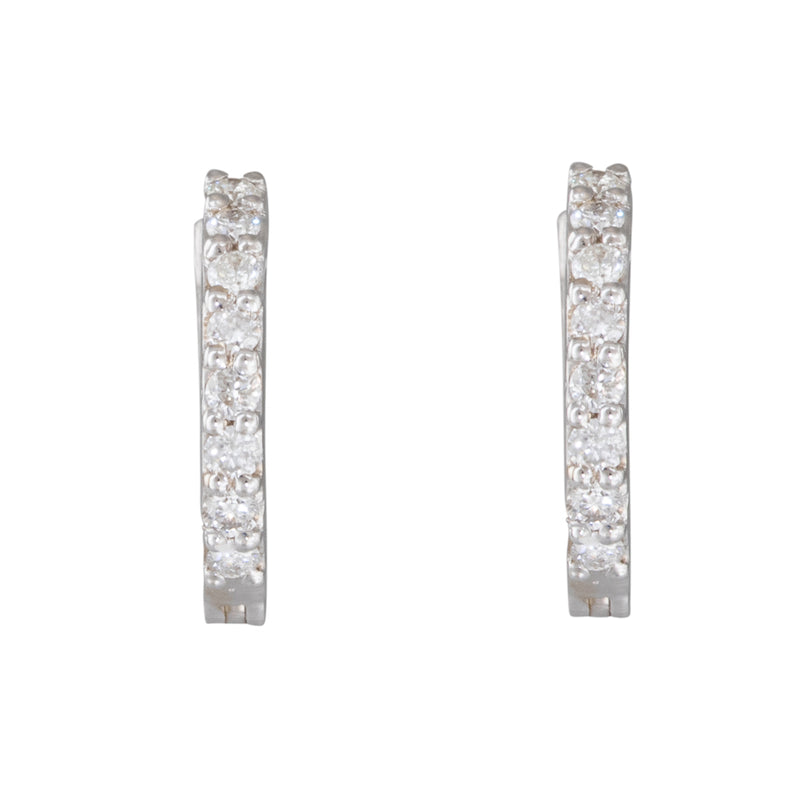 14ct white gold pair of hinged huggie earrings, each claw set down the front with eight round brilliant cut diamonds, plain polished to the reverse and fastening with click in posts.