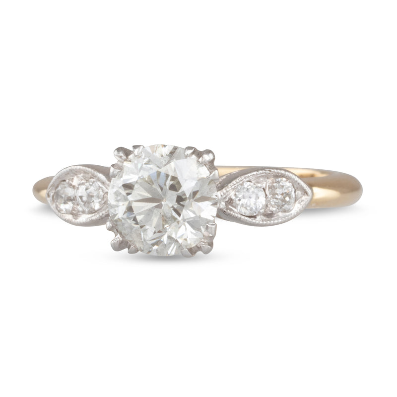 Platinum and 18ct yellow gold ring set in four triple claws with a GIA certified 1.08ct round brilliant cut diamond graded as colour K clarity VS1 on a railed gallery with millgrain edged marquise shaped shoulders each grain set with two old cut diamonds to a polished yellow gold band.