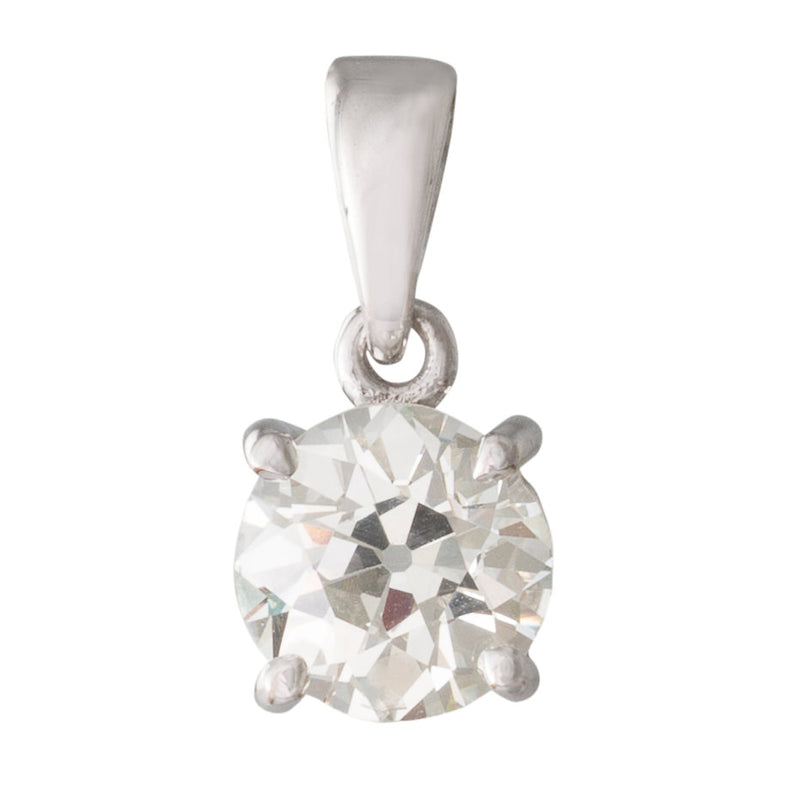 18ct white gold pendant four claw set with a GIA certified 1.78ct old European cut diamond graded as colour K, clarity SI2, on a double railed gallery, below an articulated polished bail.