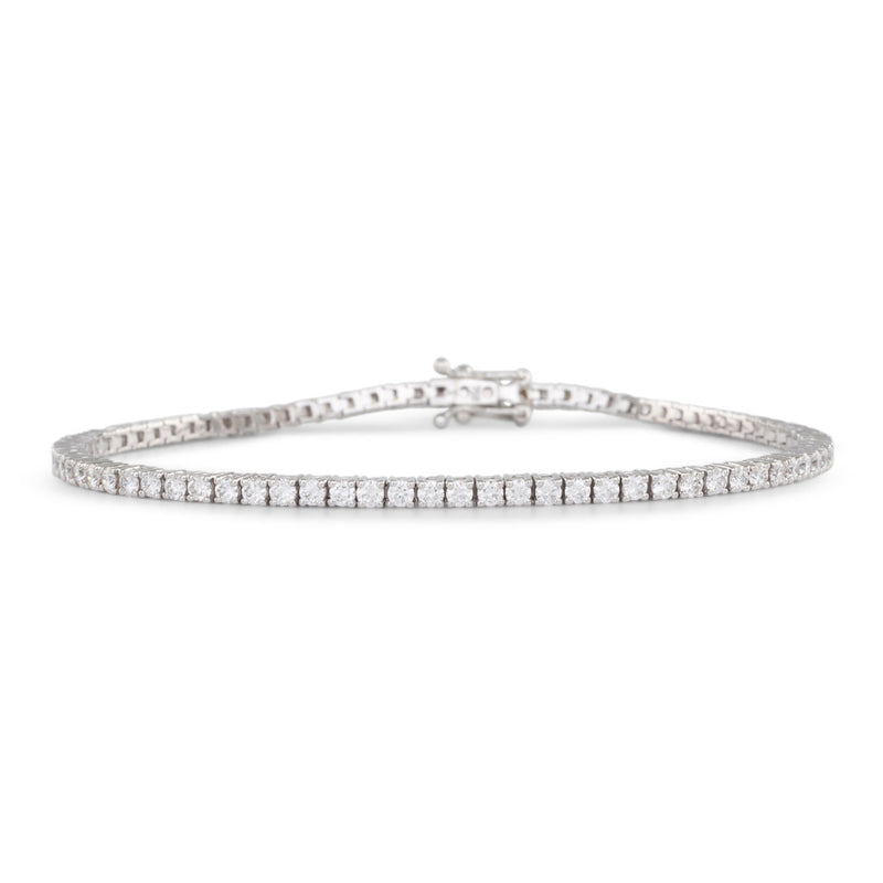 14ct white gold tennis bracelet four claw set with eighty two round brilliant cut diamonds, in individual, articulated, double railed galleries, fastening with a concealed clasp and two figure eight safety catches.