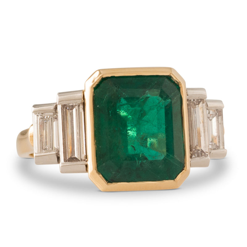 Platinum and 18ct yellow gold ring bezel set to the centre with a GIA certified 4.08ct emerald cut Zambian emerald on a double railed gallery, to either side in platinum are two end set baguette cut diamonds to upswept shoulders and a polished yellow gold band.