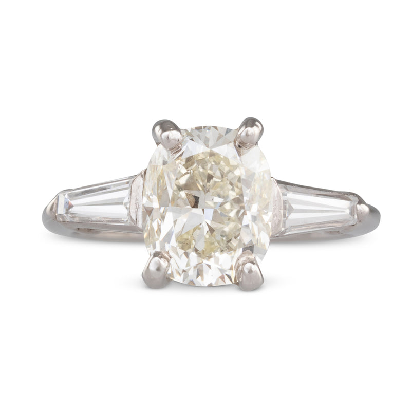 Platinum ring featuring a cushion cut diamond weighing 2.10ct, (graded M-N, VS2) in four claws, to either shoulder a tapered baguette cut diamond on a polished band.