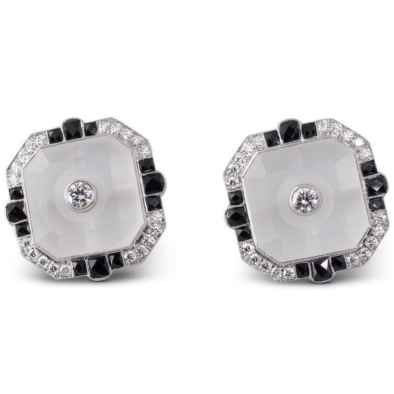 A pair of octagonal frosted quartz rock crystal earrings with diamond and French cut onyx details. Each bezel set to the centre of the quartz with a 0.10ct round brilliant cut diamond, with a surround of small brilliant cut diamonds and French cut black onyx, in 18ct white gold with posts and butterflies.