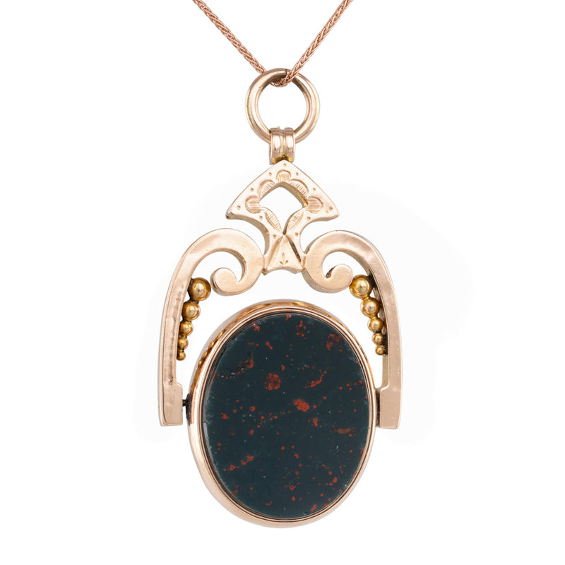10ct rose gold spinner fob set with an oval bloodstone to one side and sardonyx to the other, under an elaborate, arched frame with jump ring.