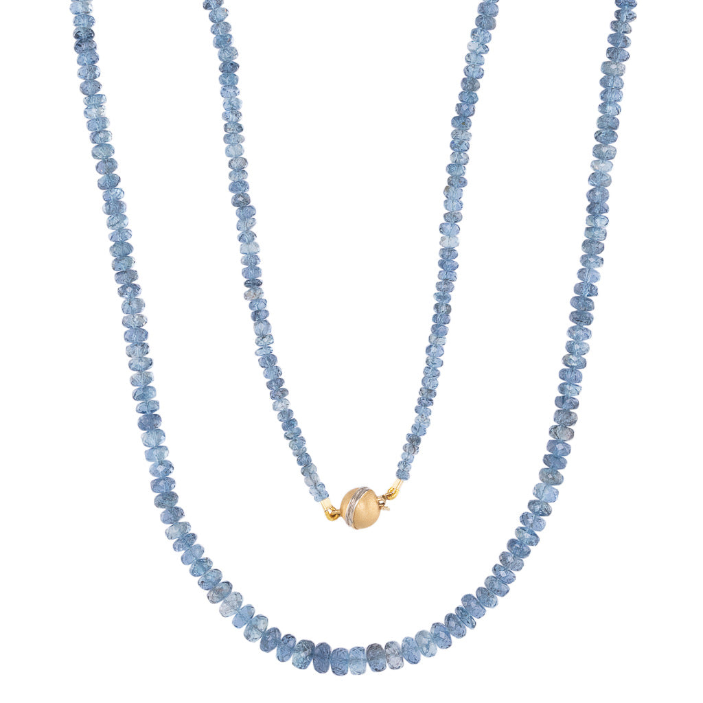 A deep blue aquamarine bead necklace with faceted beads measuring 3.0 to 6.0mm, fastening with an 18ct matte two tone ball clasp.