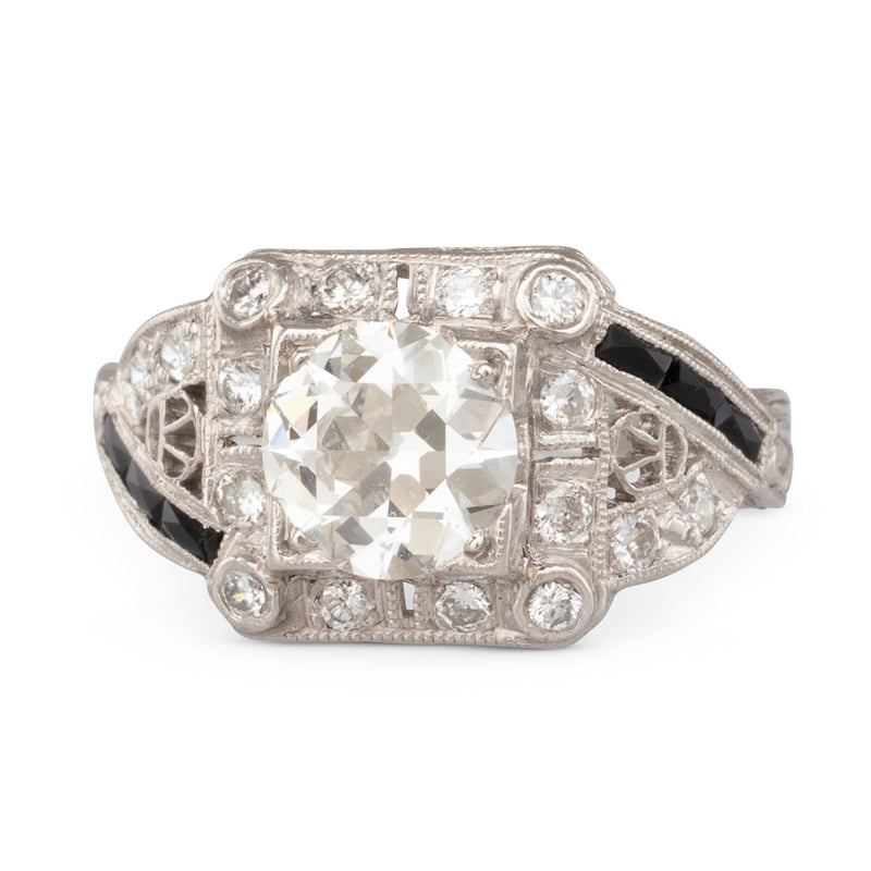 Platinum ring set in four corner claws to the centre with an 0.85ct old European cut diamond, graded as colour I, clarity VS2 in a square shaped top with a round brilliant cut diamond to each corner and pierced overlapping shoulders, one side set with onyx and the other with diamonds, engraved three quarters of the way down the band, polished at the base.