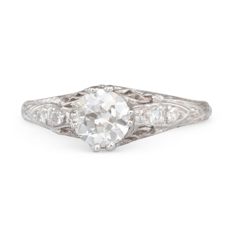 Platinum Art Deco ring with an estimated 0.56ct early transition cut diamond graded as colour G-H, clarity VS1 in a raised setting above a pierced and engraved gallery to diamond set shoulders and sides and an engraved band.