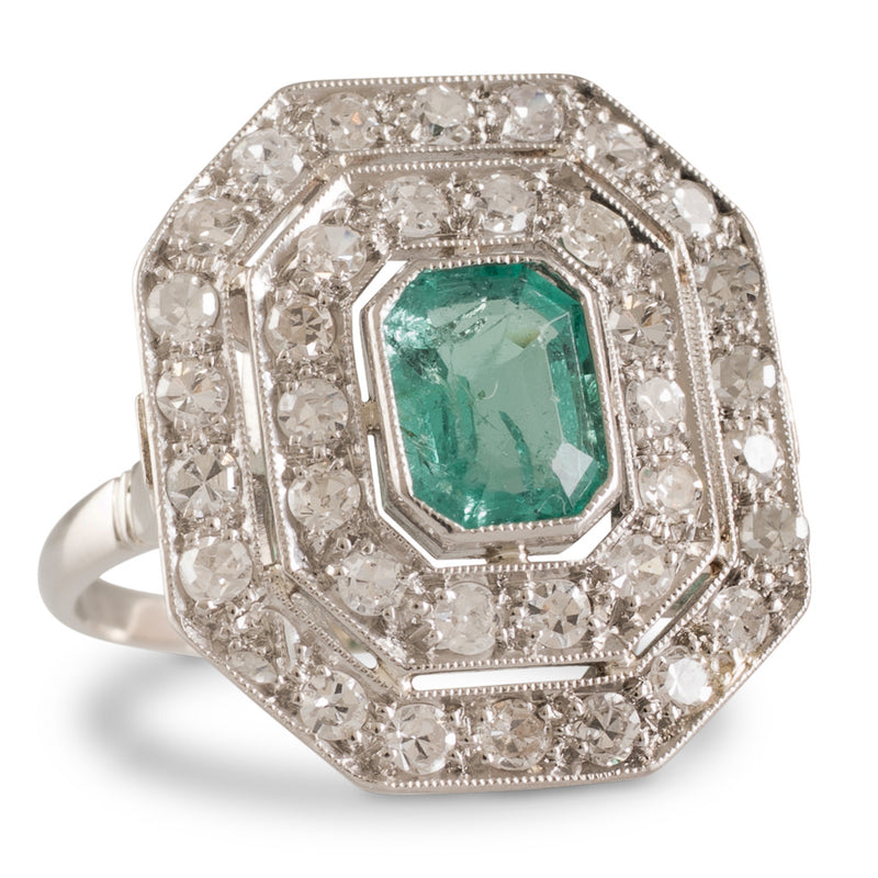 Art Deco platinum ring with a bezel set emerald cut emerald of estimated weight 0.90ct to the centre, with a double row of single cut diamonds to the surround in an octagonal shape, on a polished upswept band.