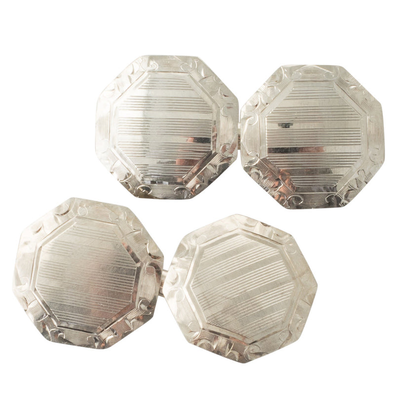 Art Deco cufflinks in 10ct white gold the four octagonal faces feature linear engraving and scalloped borders the pairs are connected by joiner links each cufflink back hallmarked EEE 10K.