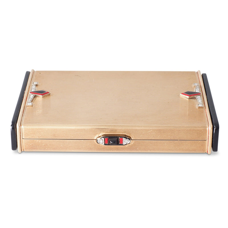 A 14ct yellow gold Art Deco box presented as a gift by the King of Spain Alfonso XIII with linear pattern top and bottom, black onyx ends, red and black enamel geometric design to both sides of the top with rose cut diamonds, a matching onyx push clasp, opening to reveal a polished interior engraved inside the lid 'Alfonso R. 20 VIII. 1932' , the case hallmarked 585, Austria and with the maker's mark JR for Johann Robesch.