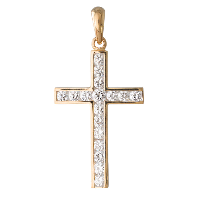 An 18ct yellow gold cross pendant channel set with seventeen round brilliant cut diamonds articulated below a polished bail