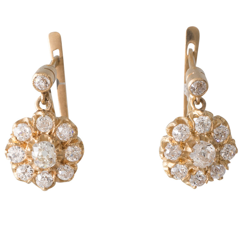 18ct yellow gold pair of diamond set daisy earrings, below a bezel set diamond stud with post and lever back, each flower with a central off-round/cushion shaped old European cut diamond, to a surround of eight smaller old European cut diamonds, all claw set.