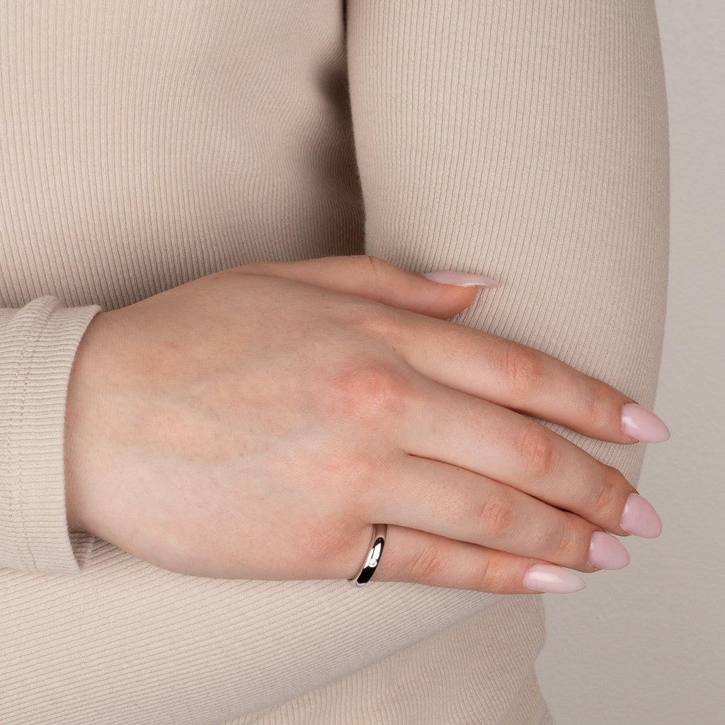 9ct white gold original comfort band, 3.5mm wide and hammer set to the centre with a 0.04ct round brilliant cut diamond.
