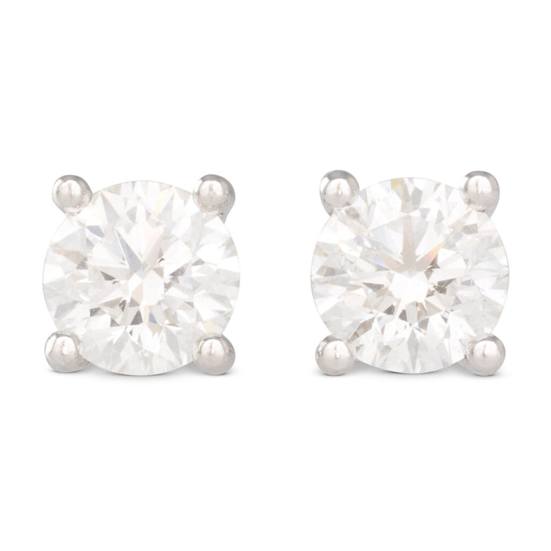 Pair of platinum stud earrings, each four claw set with a GIA certified round brilliant cut diamond weighing 1.00ct and graded as colour E, clarity SI2, in V-shaped settings with threaded posts and butterflies.