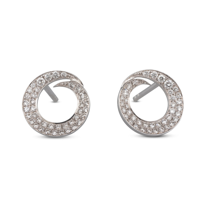 18ct white gold earrings, each in a concave circular swirl design with an open centre, grain set with thirty nine round brilliant cut diamonds, with posts and butterflies.