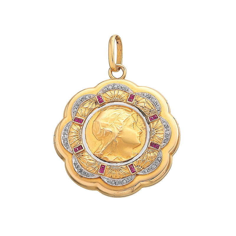 18ct yellow gold round locket with scalloped edge, a face in profile to the centre, a border of sunflowers separated by square cut rubies and a further scalloped border of rose cut diamonds in white gold with mill grain edging, opening to reveal two photo compartments, from a simple oval bail.