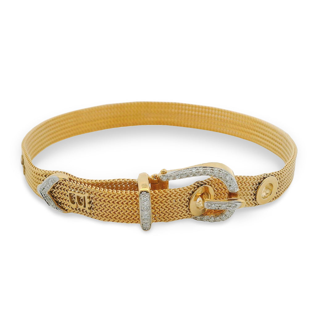 18ct yellow gold mesh bracelet with round brilliant cut diamonds set to the buckle, keeper and end of strap. Adjustable to be worn at 16 and 17.5cm.
