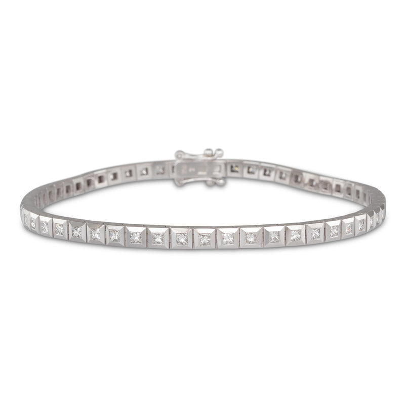 18ct white gold line bracelet, bezel set with fifty six princess cut diamonds in articulated, solid sided settings, fastening with a concealed clasp and two figure eight safety catches.