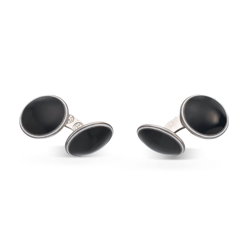 Vintage sterling silver cufflinks with round domed top plates in black enamel and a fine white border, the pairs connected by a flat sliver bar.