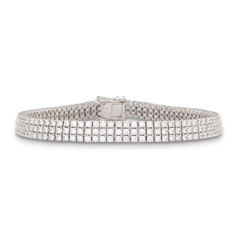 18ct white gold bracelet, four claw set with two hundred and fifty two round brilliant cut diamonds, in set of three, in articulated, railed galleries, fastening with a concealed clasp and two figure eight safety catches.