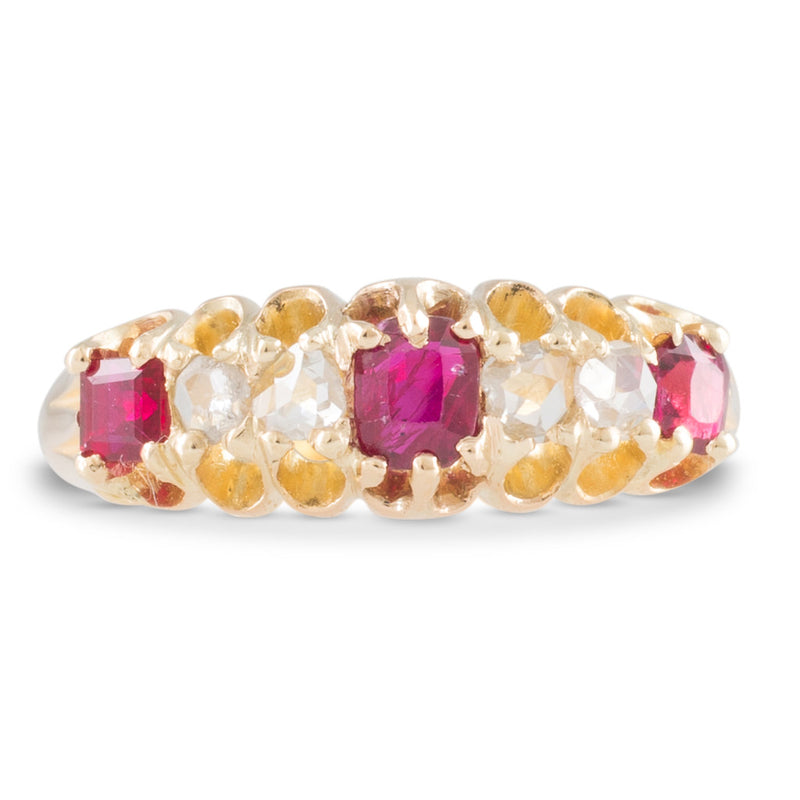 18ct yellow gold antique ring claw set with three rubies which are separated by pairs of rose cut diamonds, on a polished yellow gold band with hallmarks for 18ct, Birmingham and 1882.