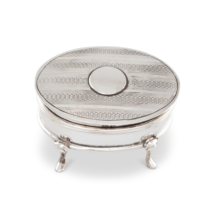 An oval sterling silver trinket box with engine turned lid and central polished circle, gilt interior to lid, fluted feet, purple satin insert and leather base.