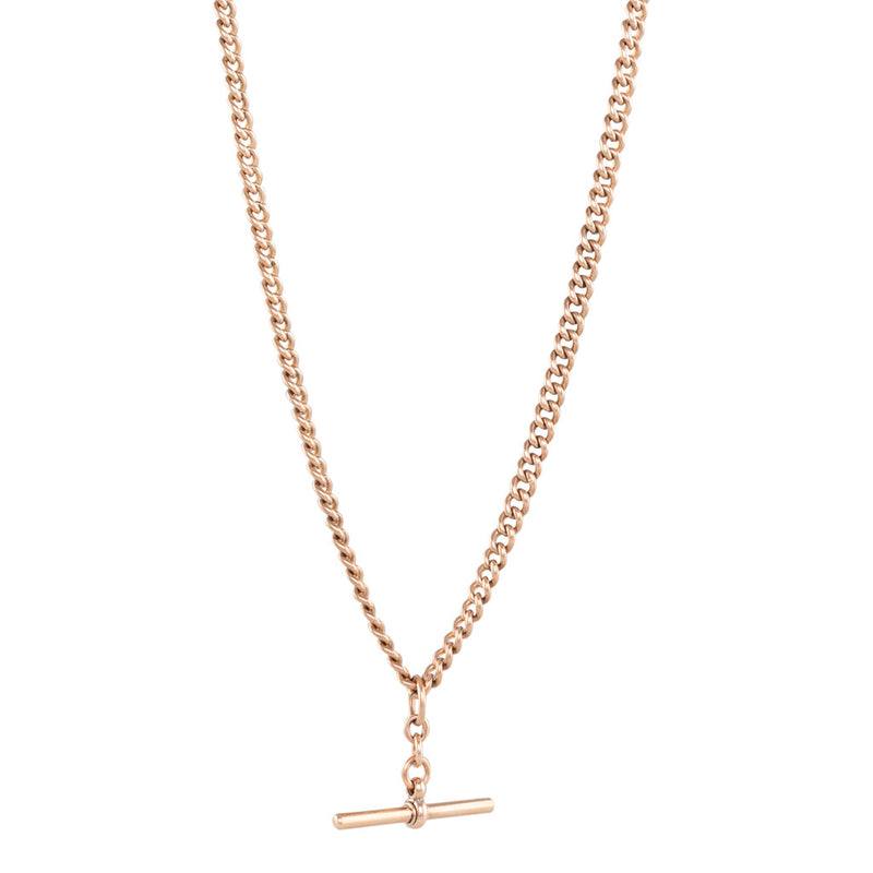 9ct rose gold curb link fob chain with a T-bar on short length of chain, fastening with two swivel clasps.