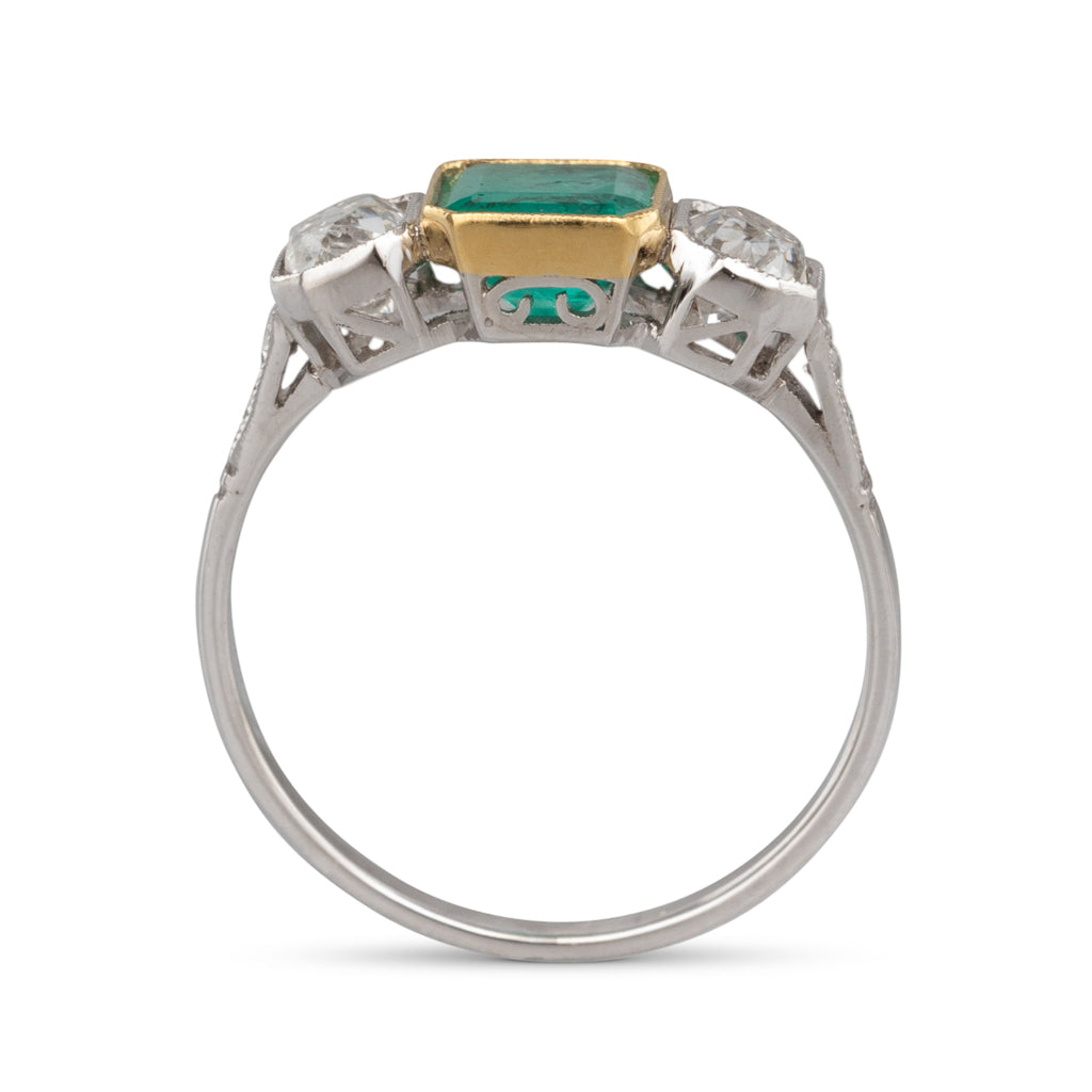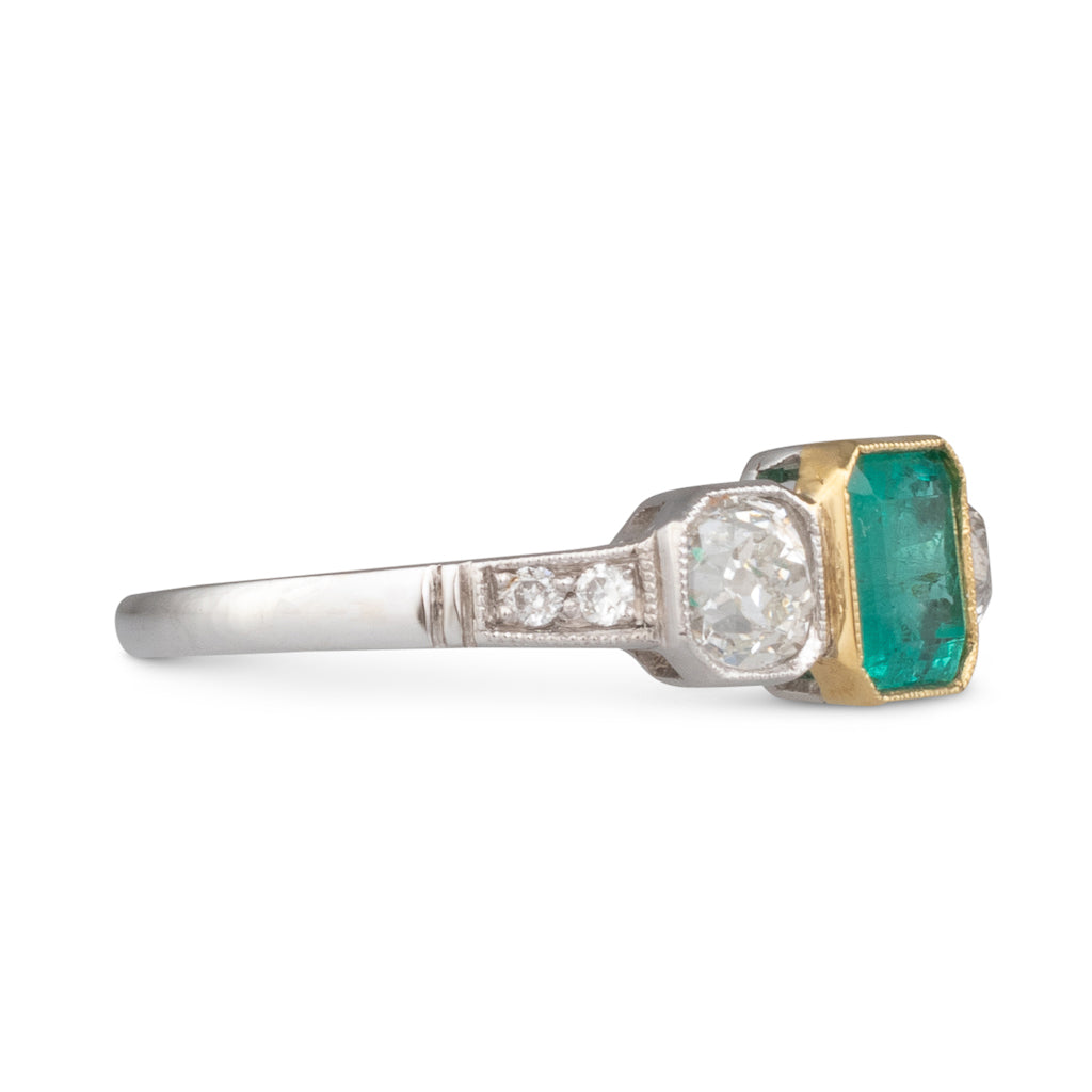 Platinum three stone ring with an octagonal emerald cut emerald of estimated weight 1.04ct in a 14ct yellow gold bezel and to either side a round old cut diamond, in mill grain edged pierced setting, to upswept diamond set shoulders and a polished band.