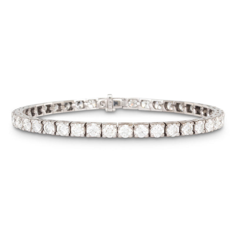 18ct white gold tennis bracelet four claw set in individual articulated pierced settings with forty one round brilliant cut diamonds fastening with a concealed clasp and fold over safety catch.