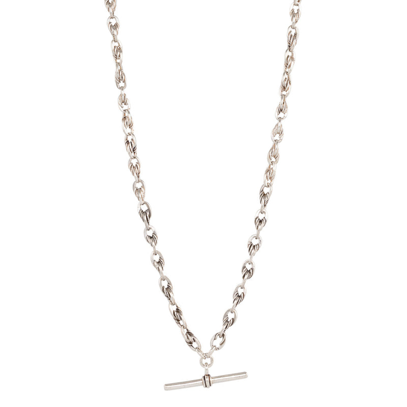 Sterling silver fancy link fob chain with T-bar and two swivel clasps, bearing worn English hallmarks and maker's marks.