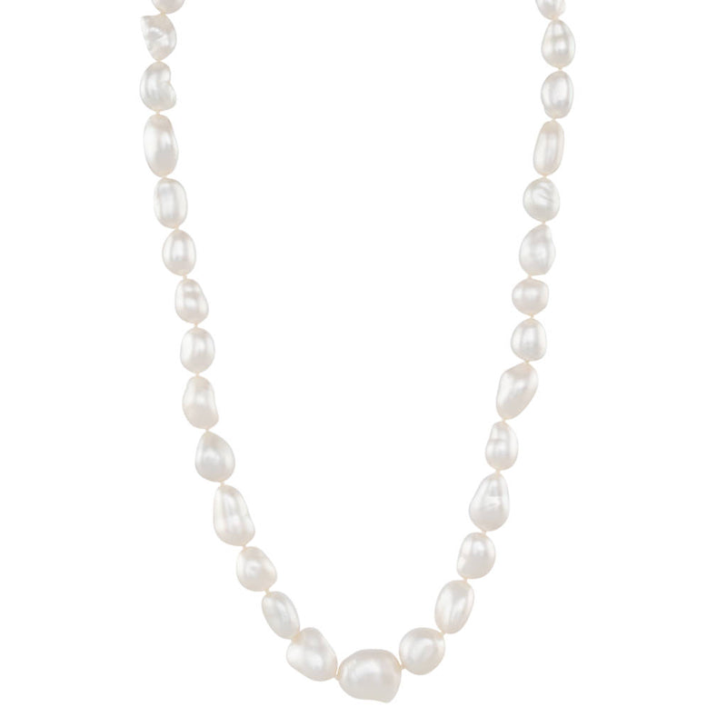 A strand of white South Sea Keshi pearls measuring approximately 10 - 13mm with a bright lustre, smooth shapes and few natural surface marks. 35 pearls threaded to a 9ct yellow gold barrel clasp.