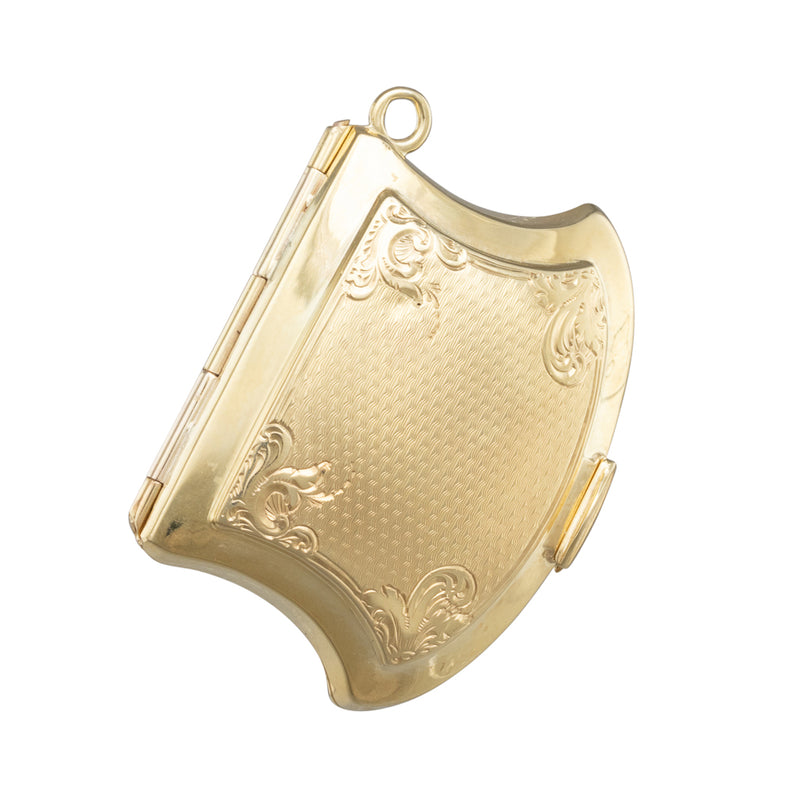 14ct yellow gold locket in the shape of a purse with engine turned pattern to both sides and scrolled corner details, the engraved latch opens to reveal two oval photo frames, with engraved surrounds.
