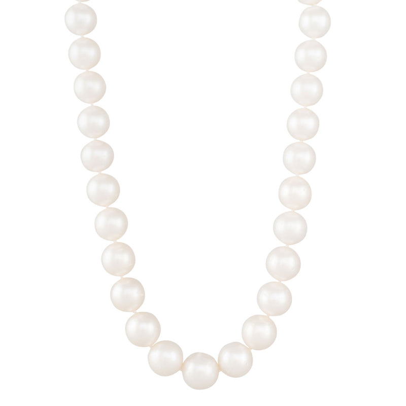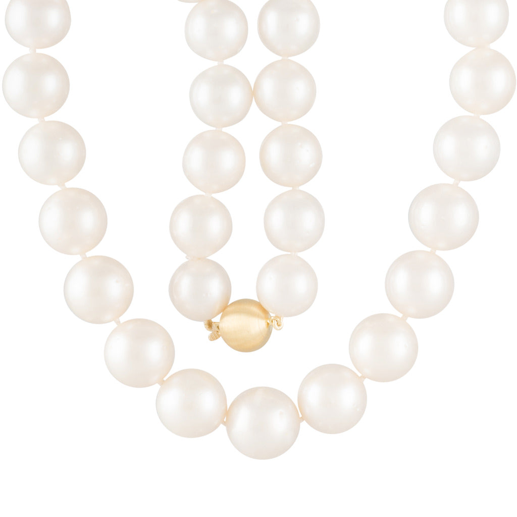 A strand of round white South Sea pearls measuring 14 - 16mm with a medium lustre and some small natural surface marks. 31 pearls threaded to a 9ct yellow gold matte finish ball clasp.