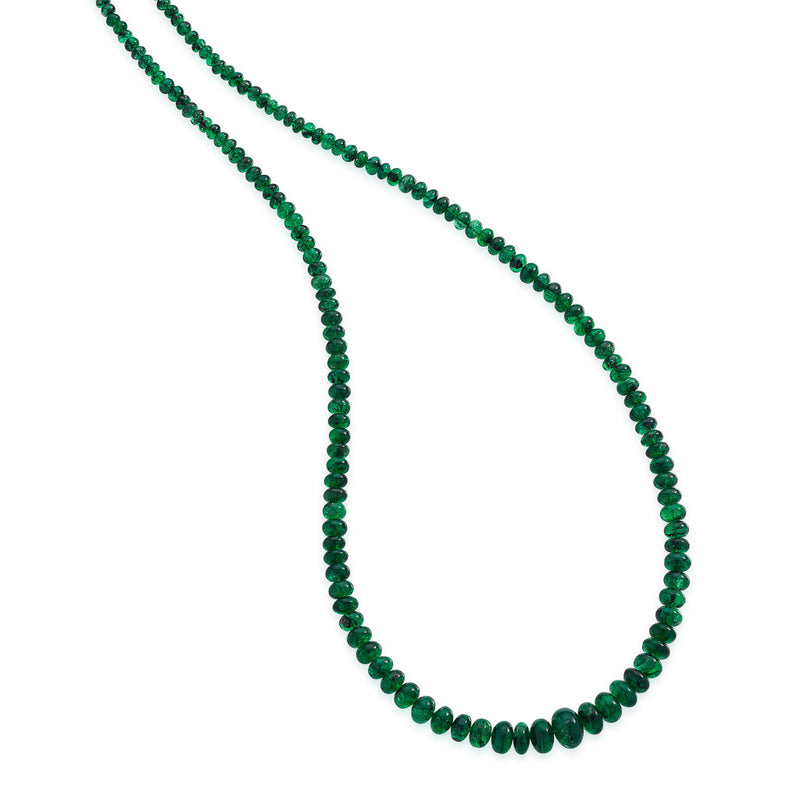 A single strand emerald bead necklace comprised of polished emerald beads measuring between 2.9mm and 8.9mm, fastening with a 14ct white gold diamond set ball clasp.