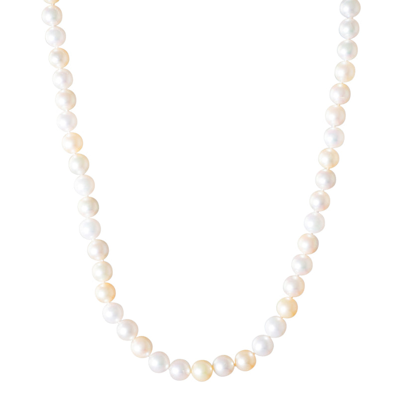 A strand of Australian Akoya pearls measuring 7.0mm with pale gold or white overtones, very high lustre, and few natural surface marks. 13 gold pearls and 42 white pearls threaded to a 9ct yellow gold ball clasp.