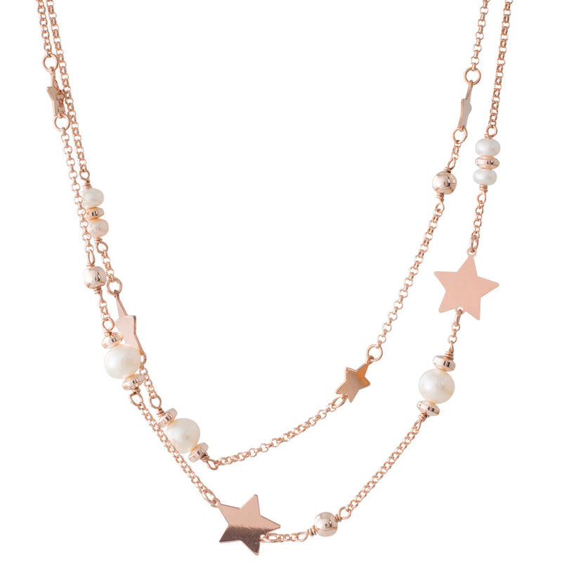 A silver rose gold plated double chain necklace featuring scattered white Freshwater pearls measuring 4 - 6mm and gold stars. The necklace is 45cm in length and has an extension length.