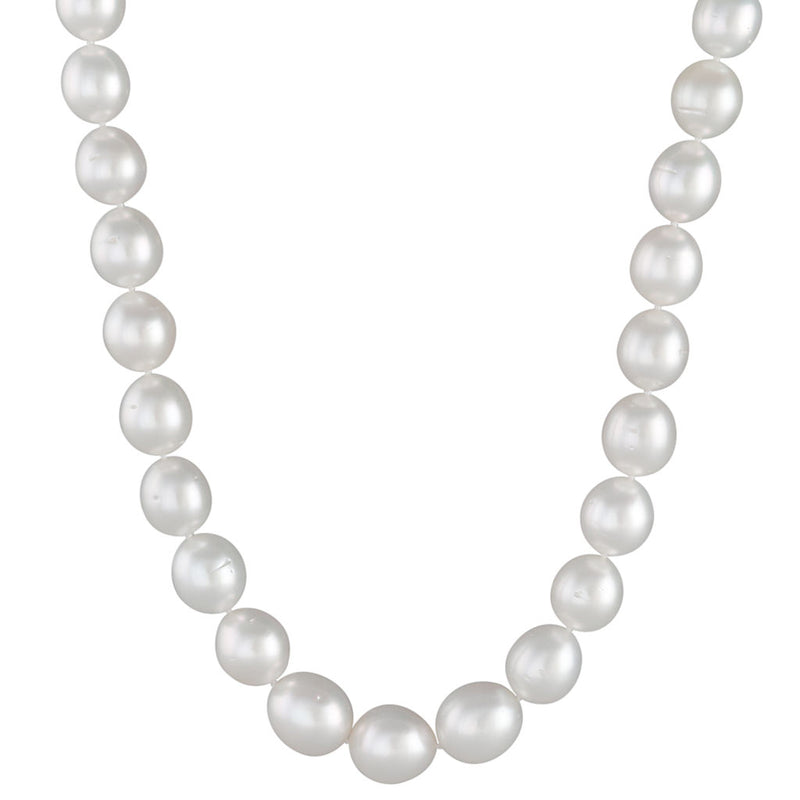 A strand of drop/oval white South Sea pearls measuring 11.1 - 14.2mm with a bright lustre, smooth shape and very few natural surface marks. 29 pearls threaded to 14ct white gold 12mm polished ball clasp