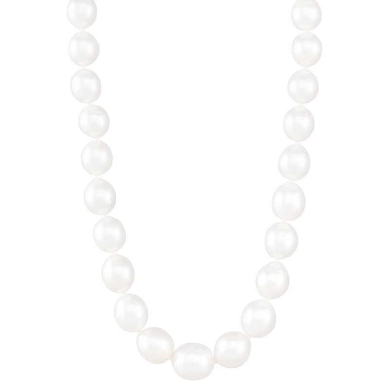 A strand of drop/oval shaped white South Sea pearls measuring 13 - 16.2mm with a bright lustre and some small natural surface marks. 27 pearls threaded to a 9ct yellow gold matte finish ball clasp