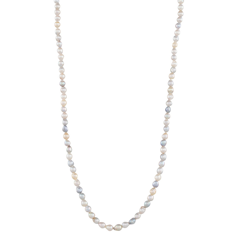 A strand of semi-baroque soft multi coloured Japanese Akoya pearls measuring 3 - 4.5mm with a bright lustre, few natural surface marks and in shades of cream and grey. Threaded to an elongated gold plated silver clasp.