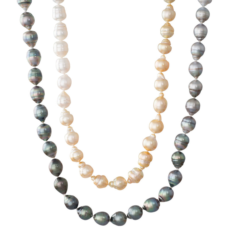 An opera length strand of shaded baroque gold and white South Sea and silver grey Tahitian pearls. The pearls measure 9 - 10mm and have a bright lustre and traditional baroque surface marks. 79 pearls