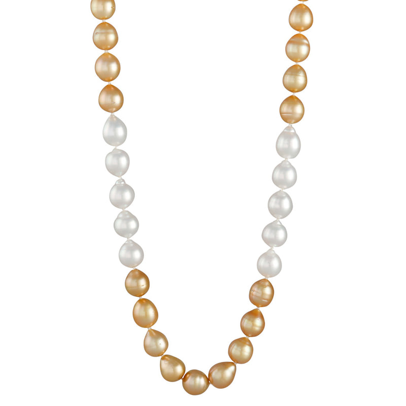 An opera length strand of baroque strong gold and white South Sea pearls measuring 9 - 11.1mm with a bright lustre and small traditional baroque markings. The gold and white pearls are in sections along the strand. 69 pearls threaded to a polished 9ct yellow gold ball clasp.