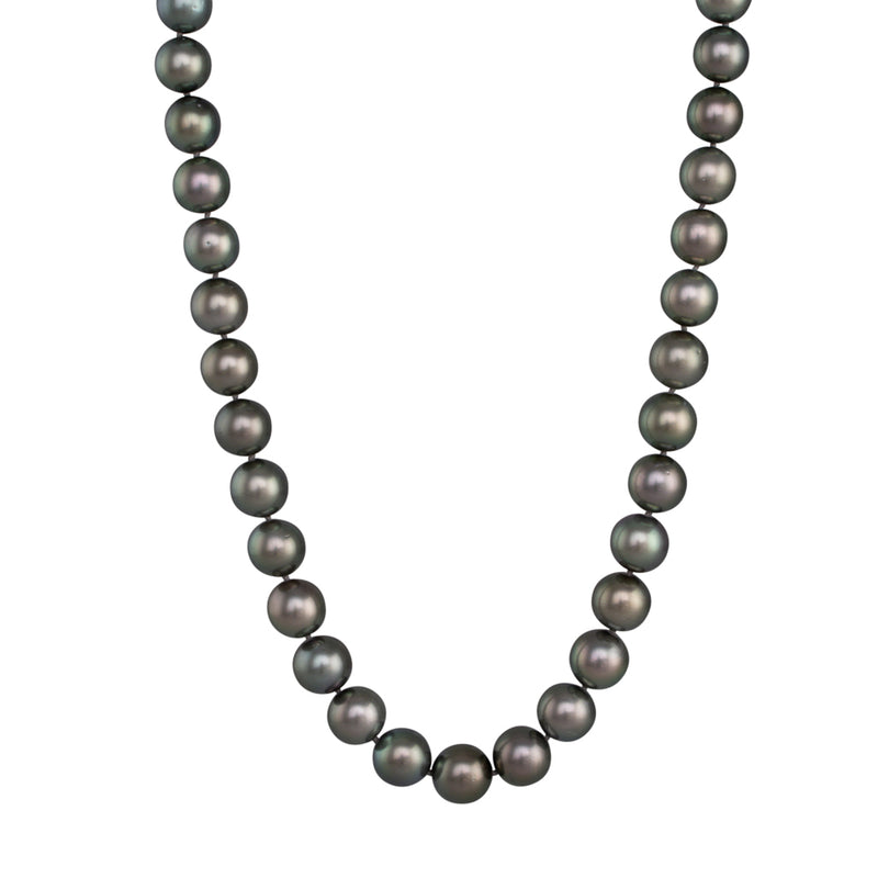 A strand of round green Tahitian pearls measuring 10 - 11.9mm with a bright lustre even colour and very few natural surface marks. 37 pearls threaded to a polished 14ct white gold ball clasp.