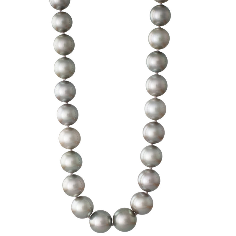 A strand of round silver Tahitian pearls measuring 9.3 - 12.2mm with a bright lustre, even colour tone and very few natural surface marks. 41 pearls threaded to 9ct matte finish white gold ball clasp.