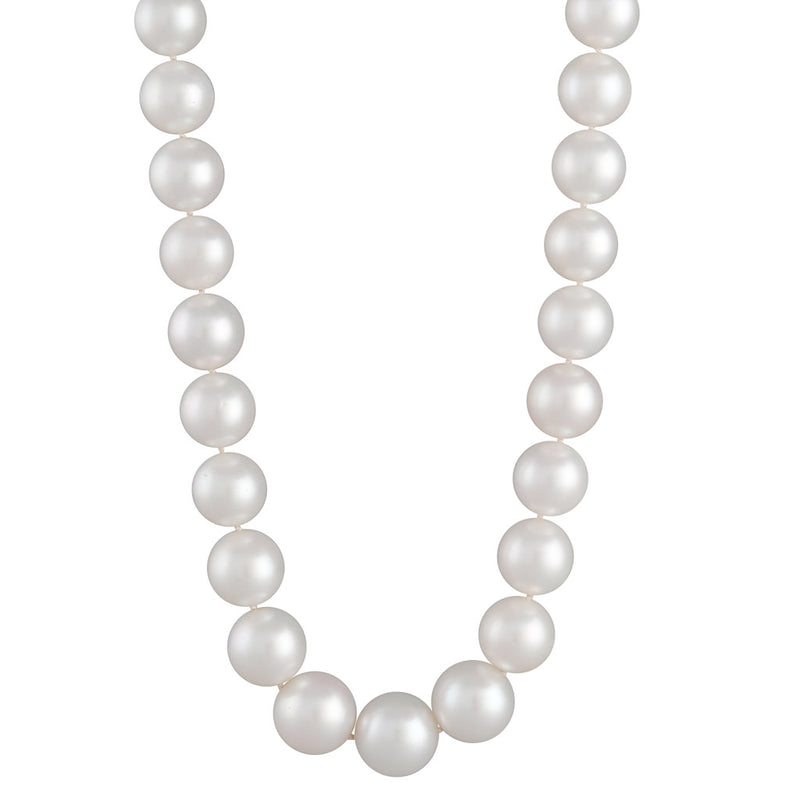 A strand of round white South Sea pearls measuring 15 - 17.5mm with a good lustre and few natural surface marks. 28 pearls threaded to a polished 18ct white gold feature ruby ball clasp.