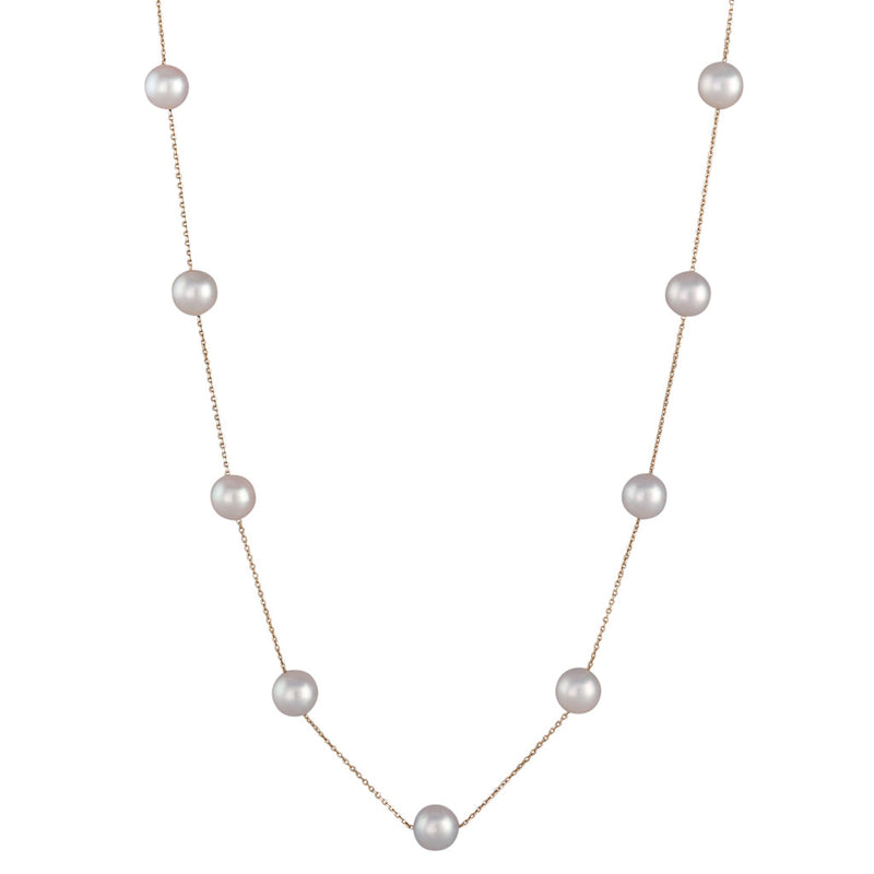 A matinee length fine 18ct yellow gold diamond cut chain featuring fifteen scattered round white/pink Japanese Akoya pearls measuring 8 - 9mm with a good lustre and few natural surface marks.