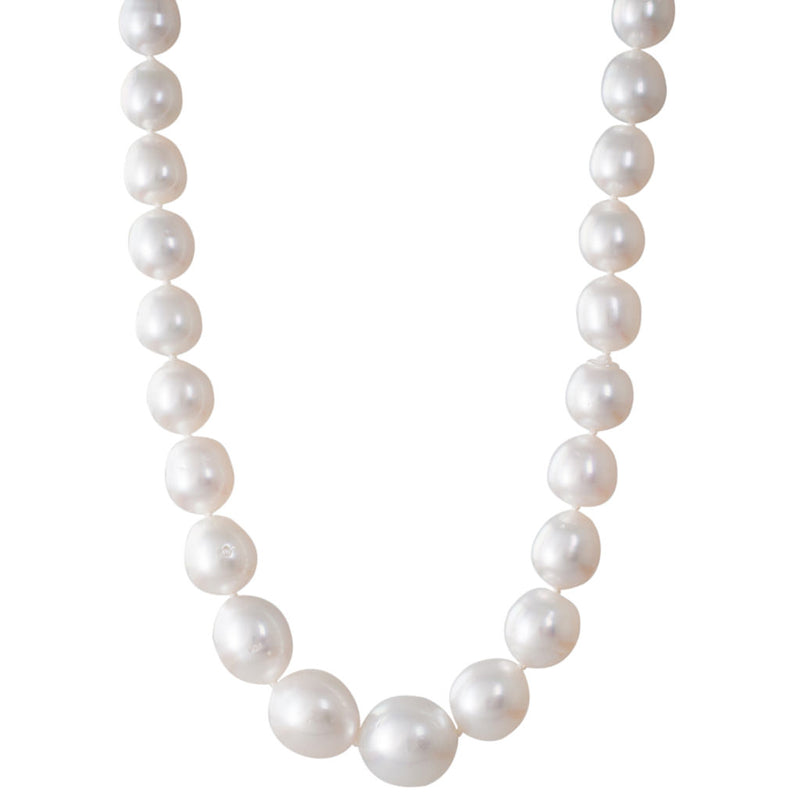 A strand of semi-baroque silver white South Sea pearls measuring 9 - 15mm with a bright lustre and some natural surface markings, threaded to a 9ct yellow gold matte ball clasp..