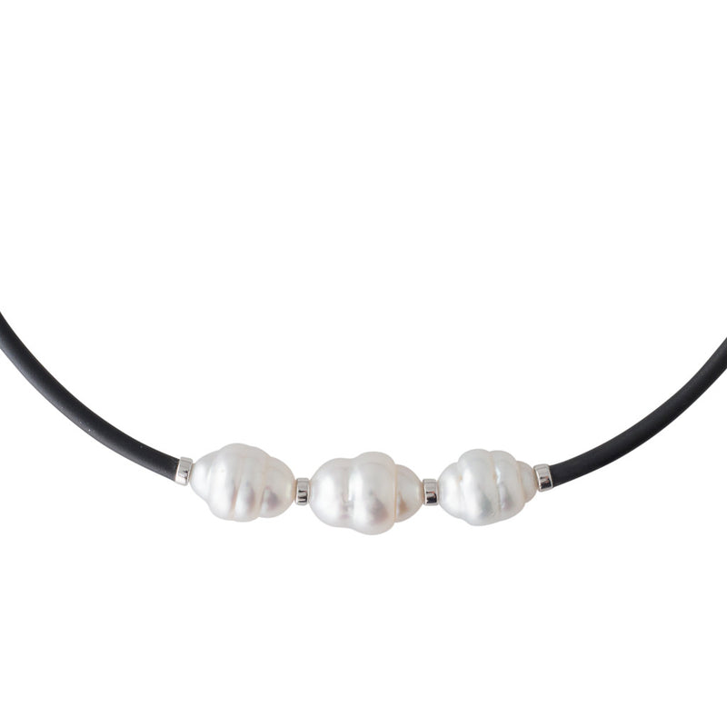 A wired black neoprene collar necklace featuring three semi-baroque white South Sea pearls measuring 10 - 11mm with a good lustre and some natural surface markings. The pearls are supported by silver set divided and shoulders and the neoprene is completed with a small pearl on each end.